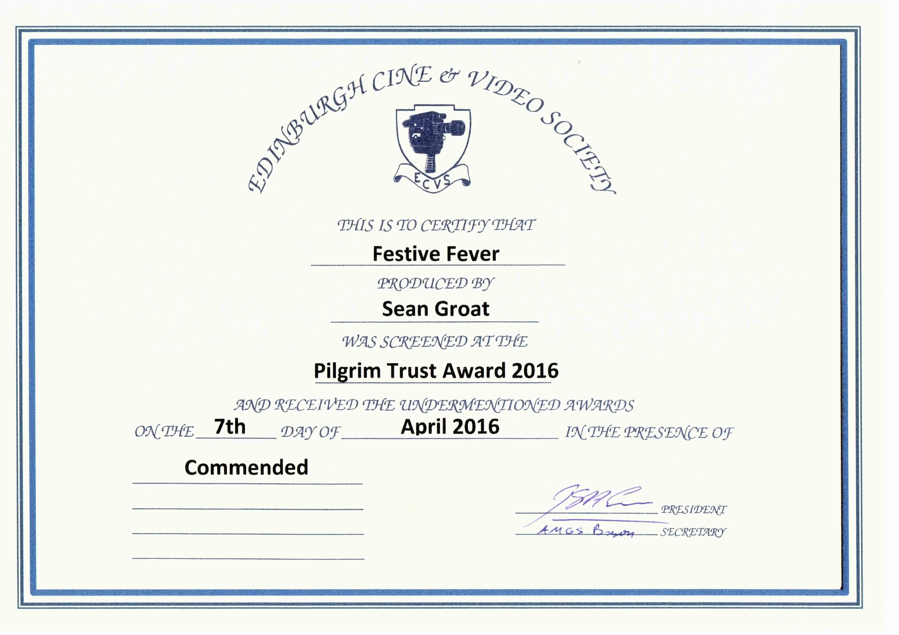 Award - Pilgrim Trust - Cert